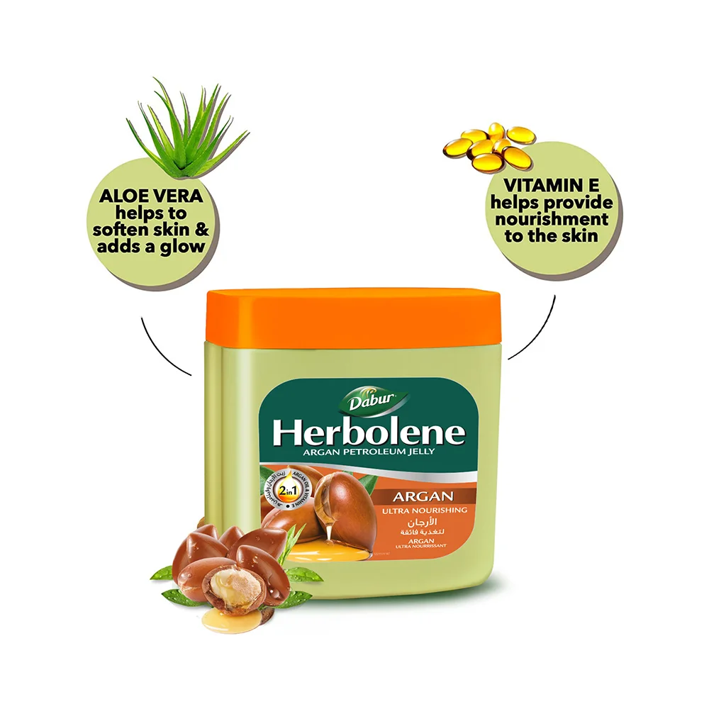 جل دابر هيربولين بزيت الأرغان هو مرطب عشبي متخصص يجمع بين قاعدة الفازلين الواقية وزيت الأرغان وفيتامين هـ لتوفير تغذية عميقة للبشرة الجافة. يُستخدم بشكل رئيسي لتهدئة الشفاه المتشققة، علاج تشققات القدمين، وتنعيم المناطق الخشنة مثل الأكواع والركبتين.