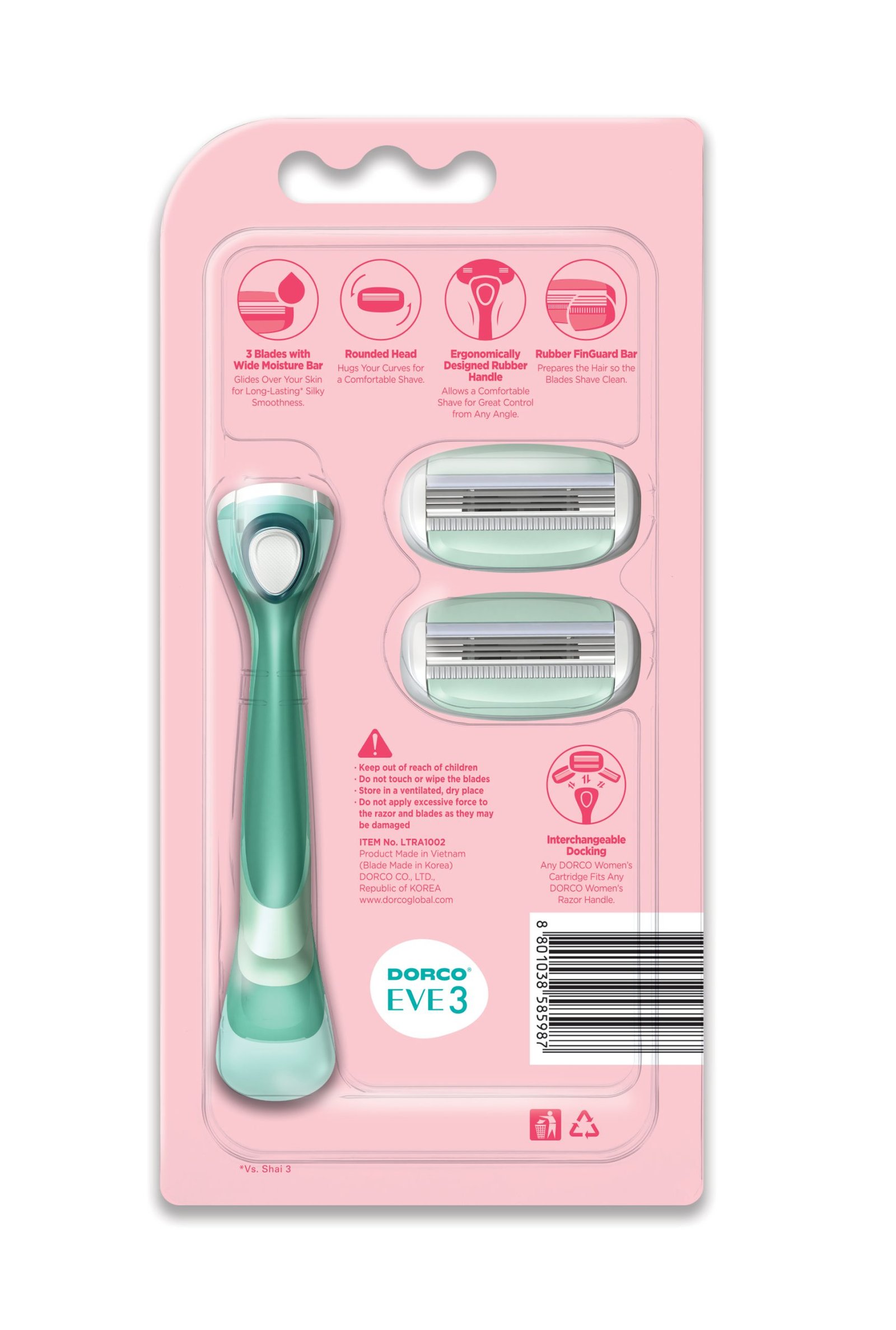 يُعد Dorco Eve 3 نظام حلاقة نسائي بثلاث شفرات، مصممًا لتوفير حلاقة دقيقة ومريحة. يتميّز برأس متحرك يتكيّف مع انحناءات الجسم لضمان نعومة مثالية.