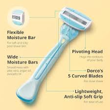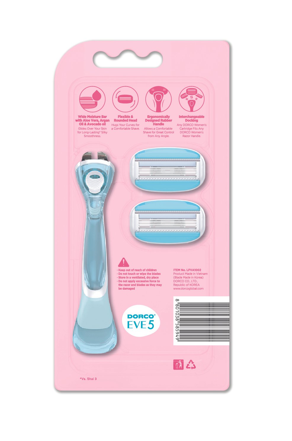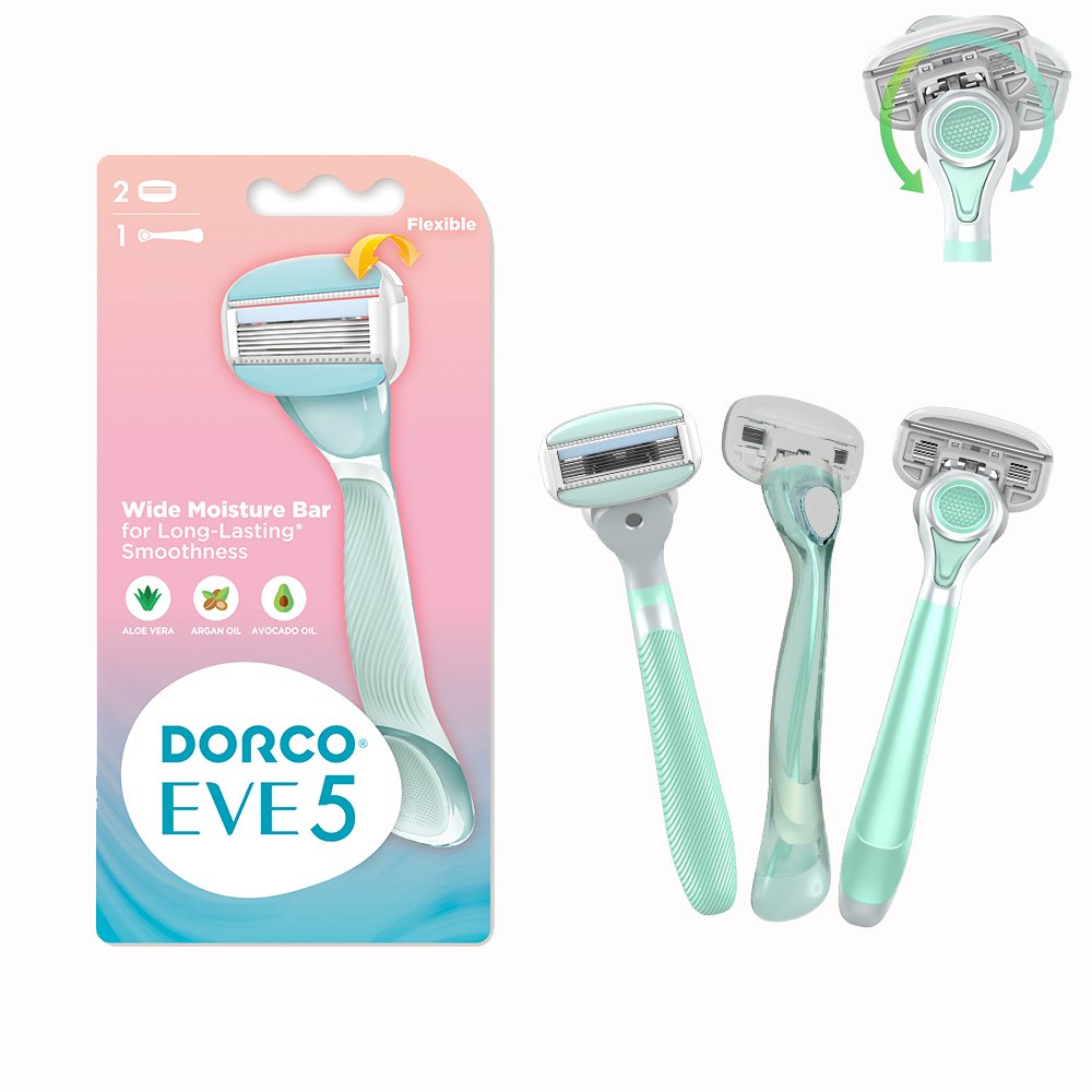 نظام Dorco Eve 5 هو نظام حلاقة نسائي فاخر بخمس شفرات، يتميز برأس متحرك، شريط ترطيب (الألوفيرا، زيت الأرجان، زيت الأفوكادو)، ومقبض إرغونومي مانع للانزلاق مصمم لتوفير حلاقة دقيقة ومريحة. يعتمد على تقنية الشفرات المنحنية لضمان انزلاق سلس وخالٍ من التهيّج على انحناءات الجسم.