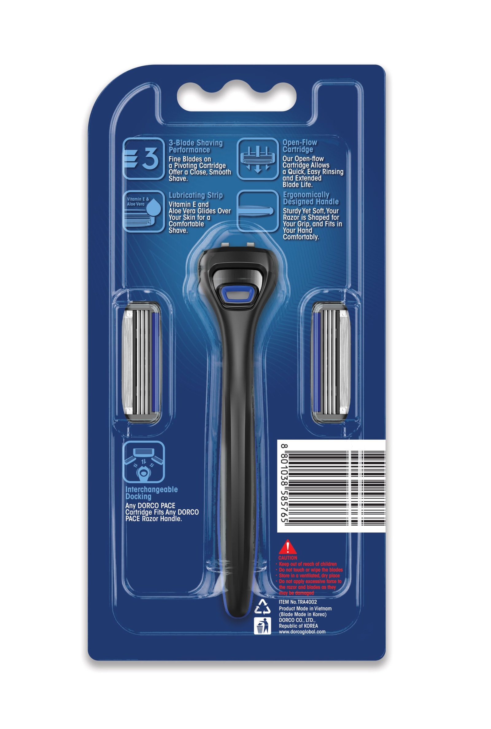 نظام Dorco Pace 3 هو نظام حلاقة بثلاث شفرات مصمم لتوفير حلاقة دقيقة ومريحة مع تقليل التهيّج. يتميز برأس متحرك، شريط ترطيب غني بالألوفيرا وفيتامين E، ومقبض إرغونومي، وغالبًا ما يُباع مع عدة رؤوس بديلة لتوفير قيمة عالية للعناية الشخصية.