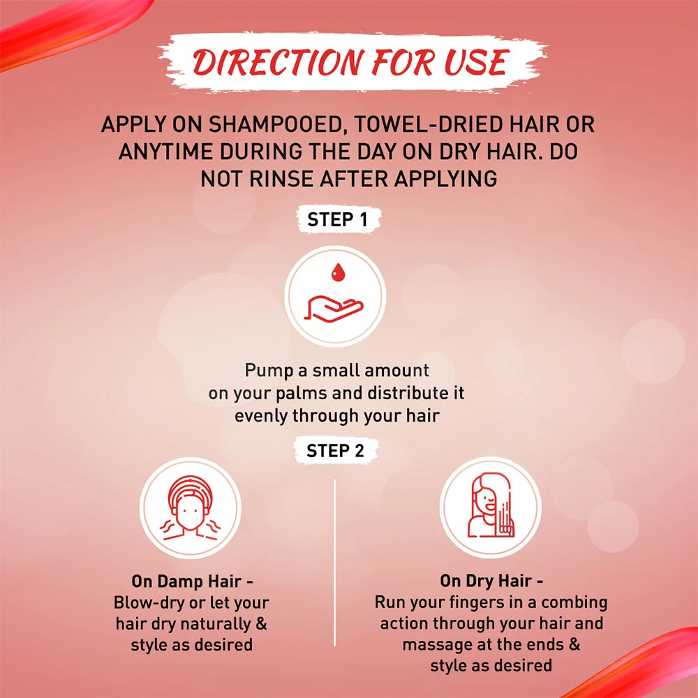 طريقة الاستخدام: يوضع على الشعر المغسول والمجفف بالمنشفة أو في أي وقت خلال اليوم على الشعر الجاف. لا يُشطف بعد التطبيق.