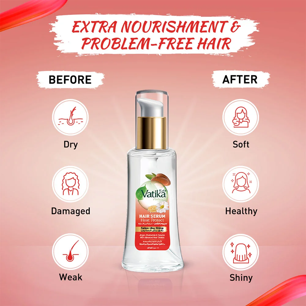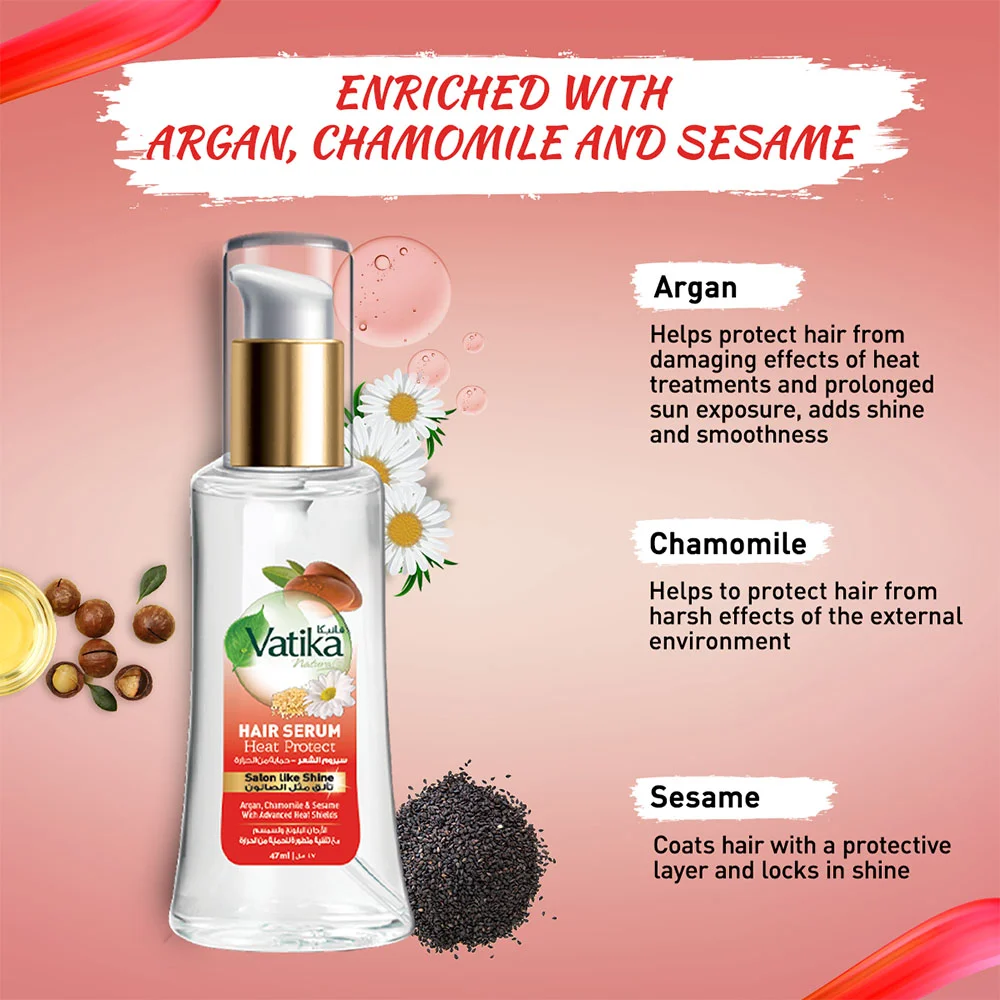 المكونات الطبيعية: يحتوي سيروم الشعر من فاتيكا ناتشورالز على مستخلصات طبيعية من الأرجان، والبابونج، والسمسم التي تحمي الشعر من الحرارة والأضرار الأخرى الناتجة عن التعرض المطول لأشعة الشمس.