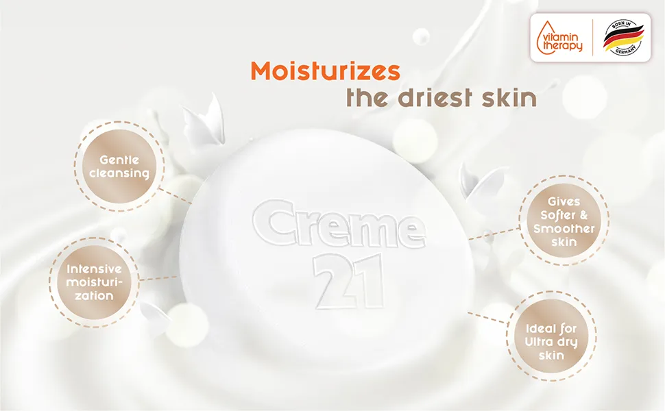 مصنوع من منظفات طبيعية، يجمع هذا الصابون بين تركيبة تنظيف فائقة اللطف وخصائص الترطيب والتغذية لفيتامين E وزيت اللوز. صابون كريم 21 المرطب المكثف يرطب بشرتك دون أن يخل بتوازنها الطبيعي للرطوبة، مما يتركها ناعمة وملساء بشكل واضح.