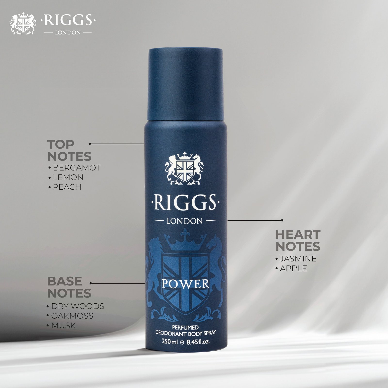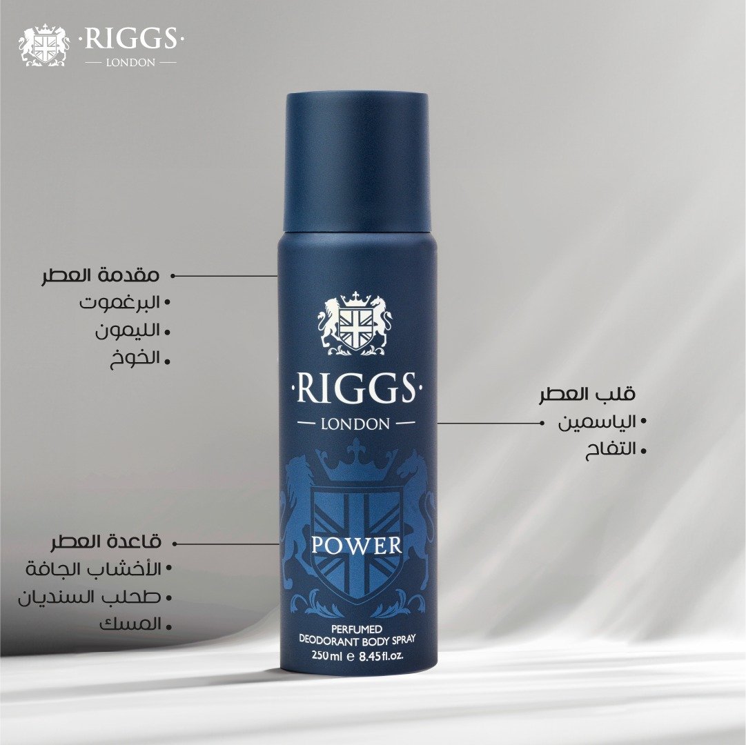 مزيل العرق الرجالي Riggs London Power هو الأكثر تألقًا عندما يتعلق الأمر بالثقة والأناقة. بحجم مثالي 250 مل، يجمع هذا البخاخ بين الانتعاش والثبات، ليضفي على يومك إشراقة لا تضاهى. نفحات عليا: انغمر في عبير منعش من البرغموت والليمون والخوخ، لتبدأ يومك بحيوية وانتعاش. قلب العطر: الياسمين الدافئ والتفاح اللذيذ يضفيان لمسة من الرقة والجاذبية. القاعدة: الأخشاب الجافة، البلوط، والمسك يوفران ثباتاً لا يُنسى.