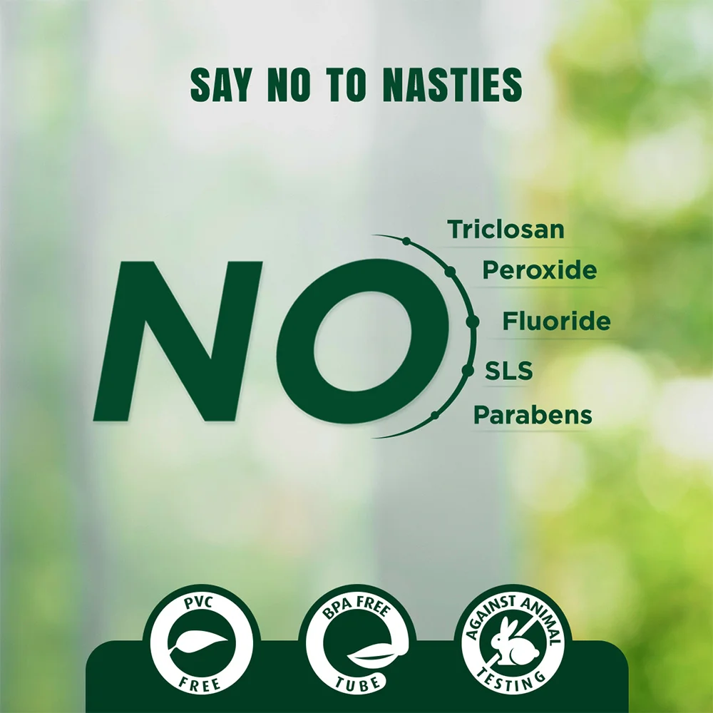 - تركيبة خالية من المواد الضارة: خالٍ من المواد الكيميائية الضارة مثل الفلورايد، البارابين، SLS (كبريتات لوريل الصوديوم)، الكحول، التريكلوسان، والبيروكسيد.