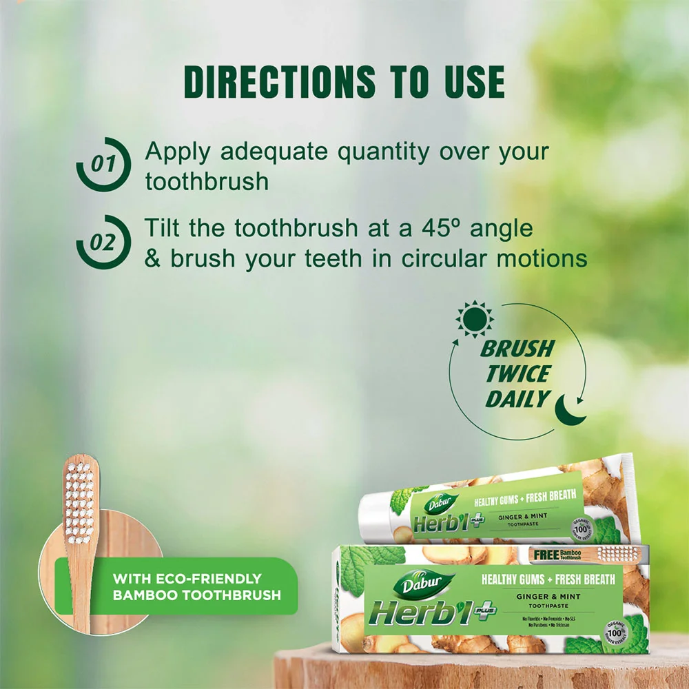 معجون أسنان دابر هيربل بلس بالزنجبيل والنعناع هو منتج للعناية بالفم خالٍ من الفلورايد، مُصمم لتحسين صحة اللثة وتوفير نفس منعش يدوم طويلًا باستخدام مستخلصات عضوية 100٪.