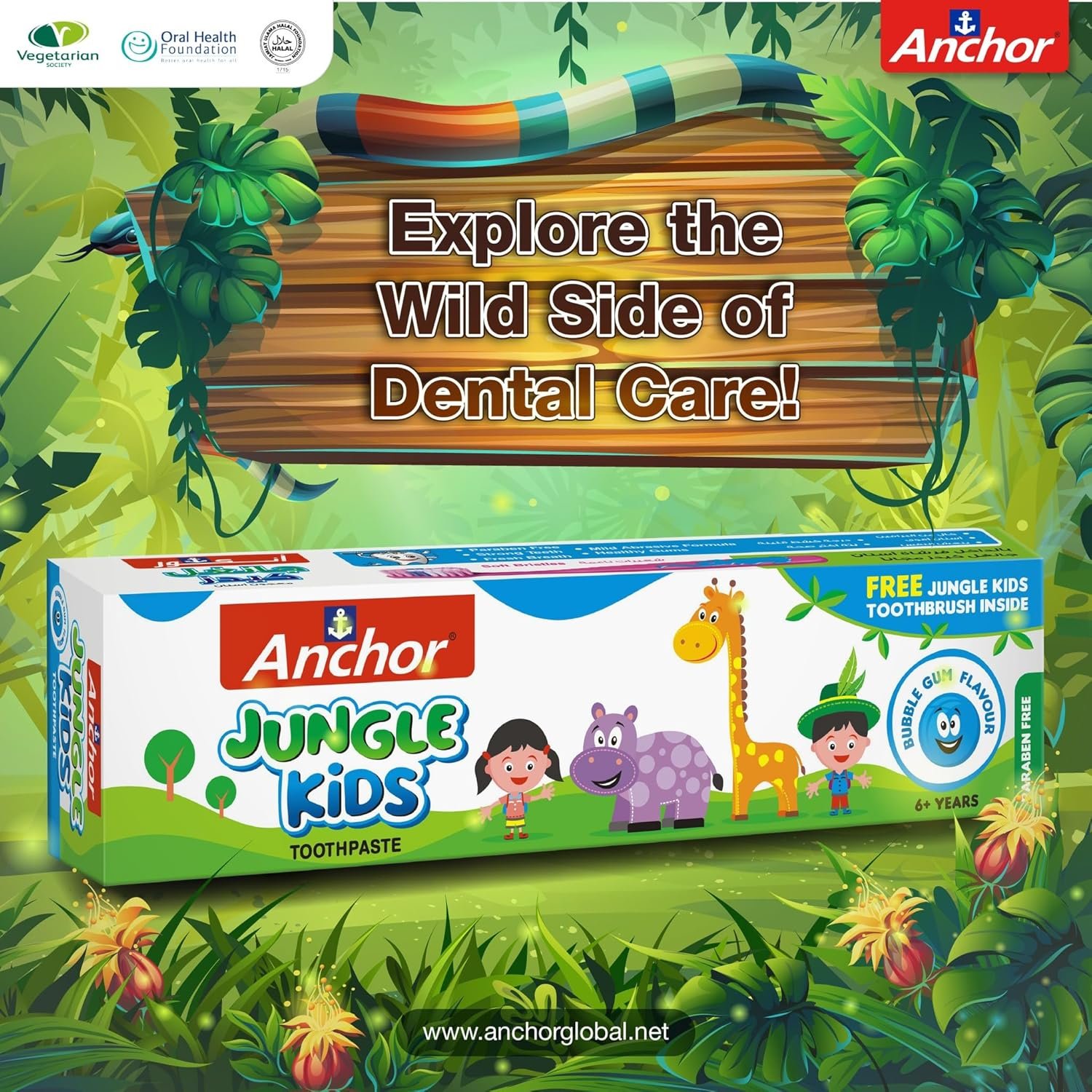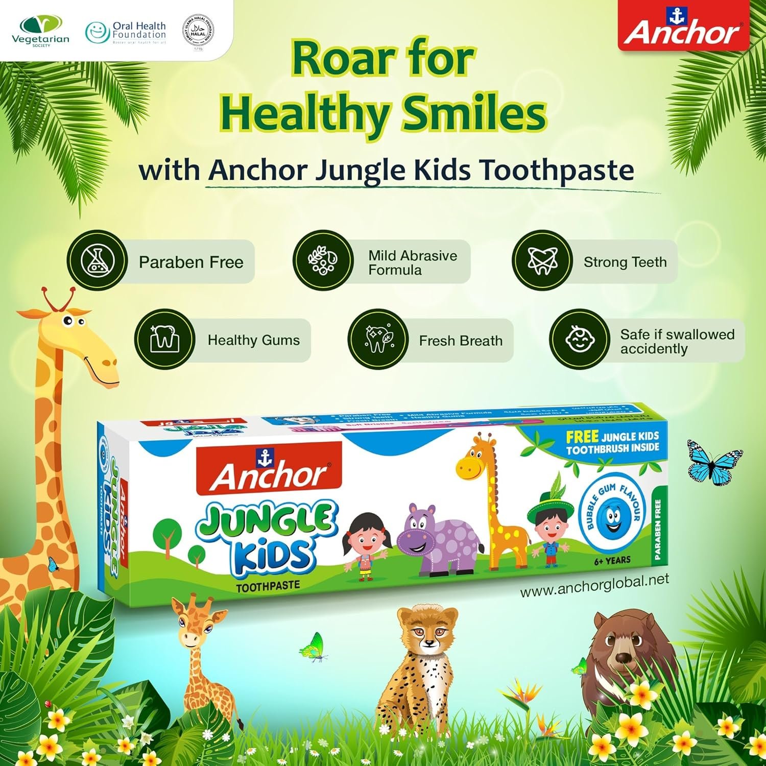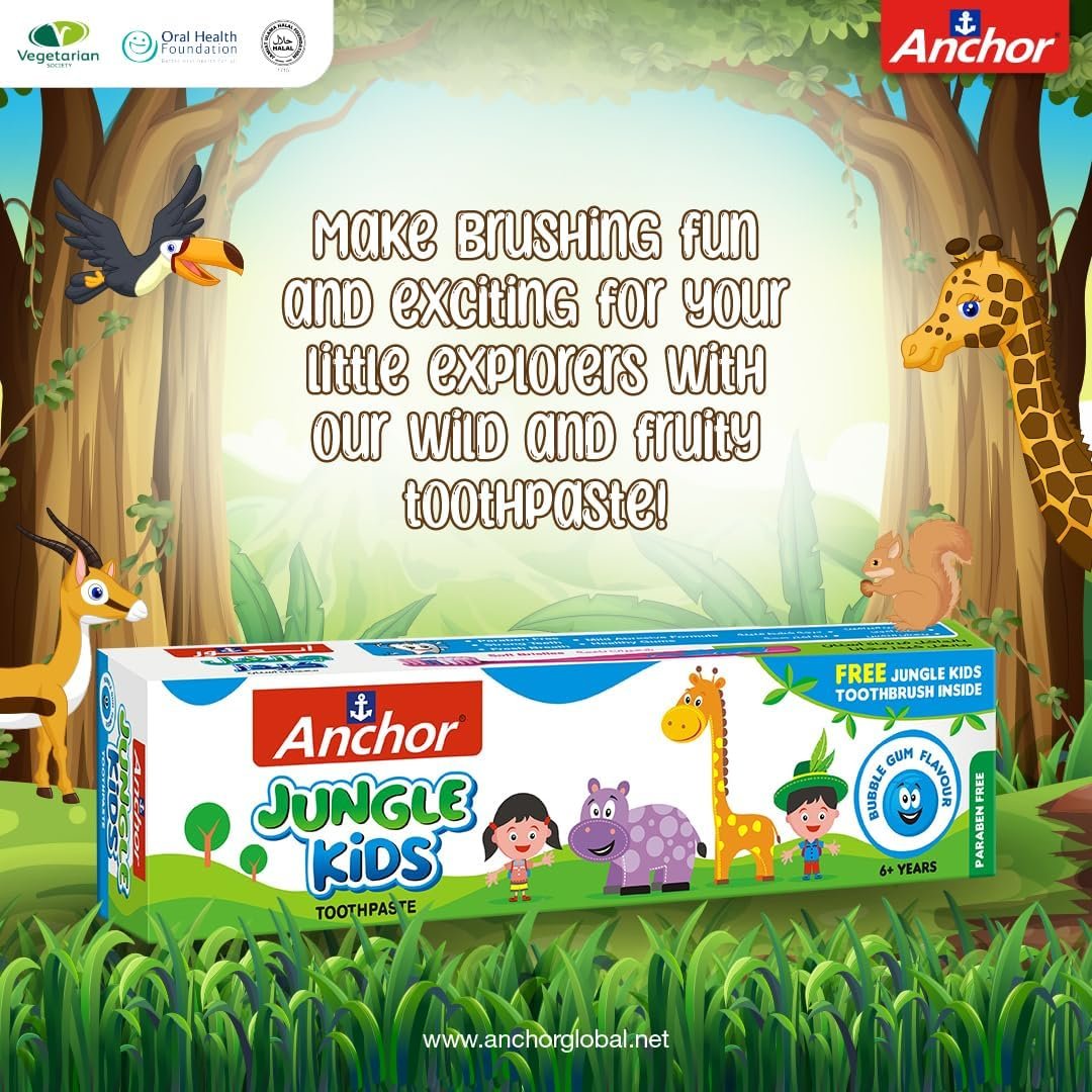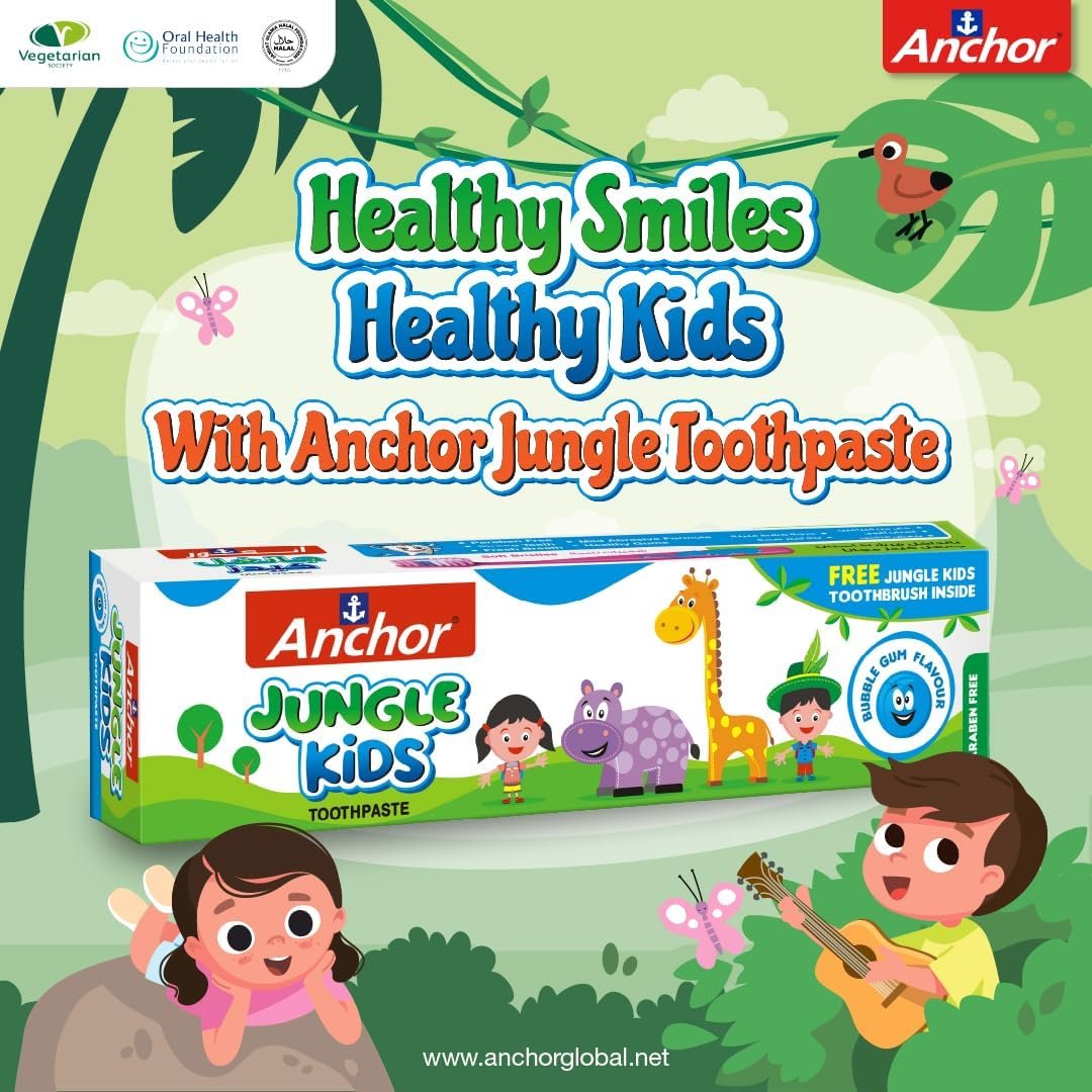 Anchor Kids Toothpaste Bubble Gum Flavor 50gm is a fun, flavorful toothpaste designed to make brushing enjoyable for children. With its sweet Bubble Gum taste, it encourages kids to brush regularly while protecting against cavities and plaque. The fluoride-enriched formula is gentle on young teeth and gums, helping to keep their smiles healthy and strong. Perfect for little ones, it makes oral care fun and easy!