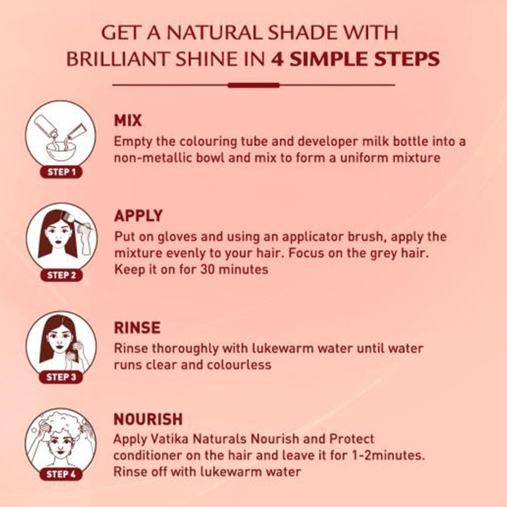 • Directions Of USE: 1. Uniformly mix the coloring tube and developer milk bottle. 2. Apply evenly on grey hair using an applicator brush and keep for 30 minutes 3. Rinse thoroughly 4. Apply Vatika Conditioner and rinse it off
