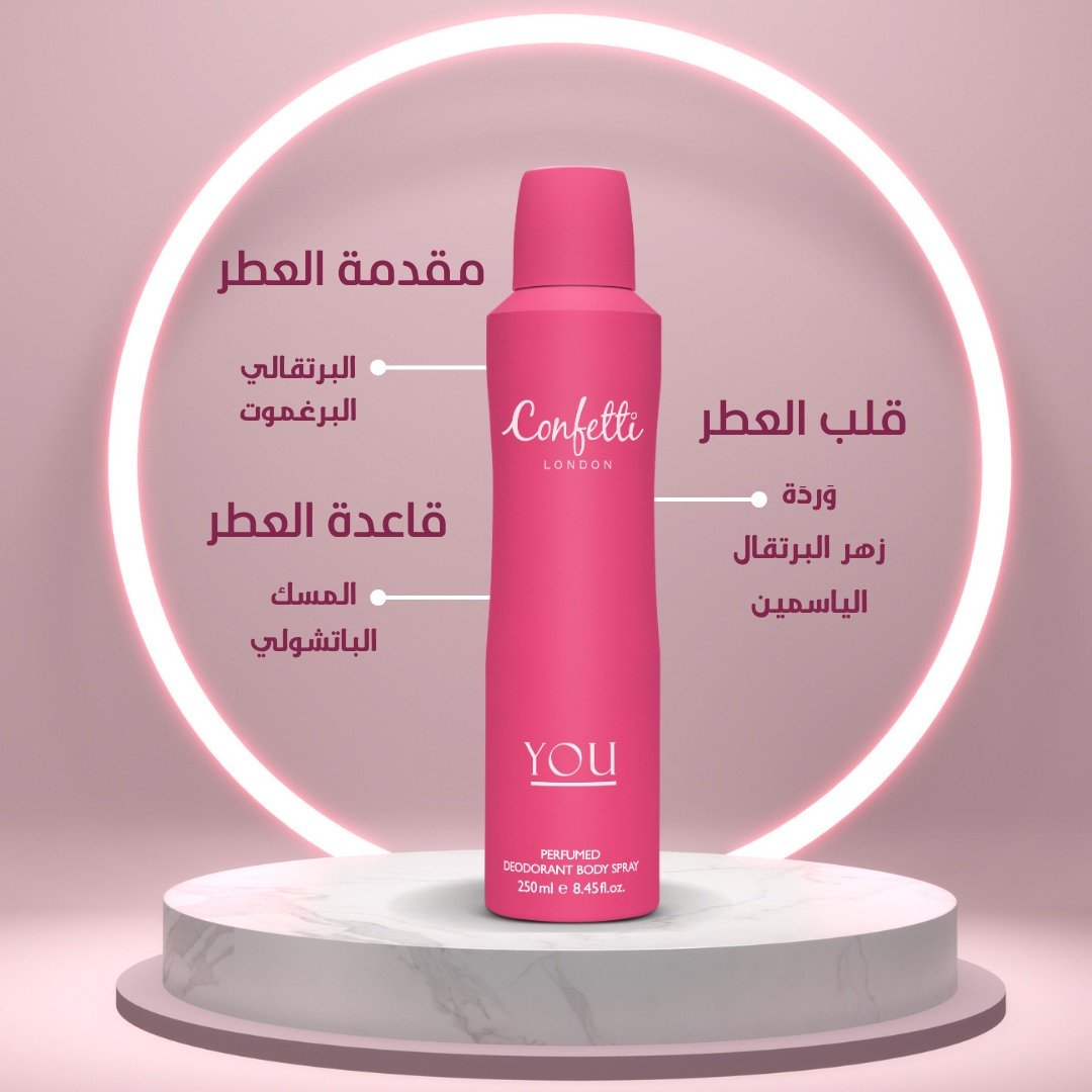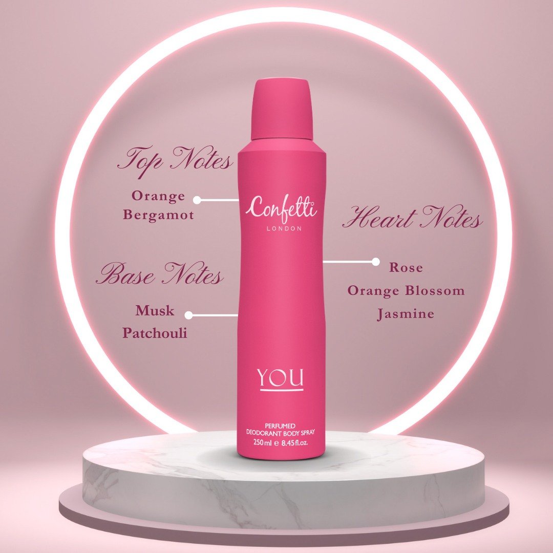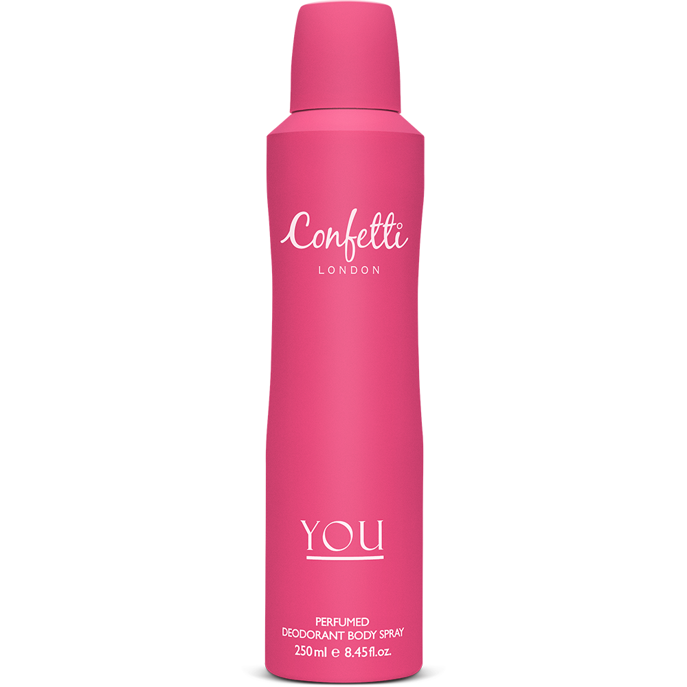 Confetti London YOU Deodorant Body Spray 250 ml is crafted for the bold, the bright, the you. It celebrates your energy by combining fresh fruity top notes, delicate floral heart tones and a soft base that lingers pleasantly. Whether you’re heading to meetings, brunches or evenings out, YOU becomes your signature fragrance.