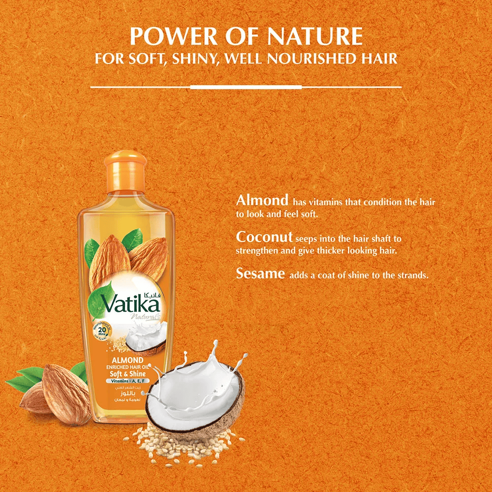 Nourish your special hair strands simply in 20 minutes with Vatika Naturals Almond Enriched Hair Oil for Soft and Shiny hair with the benefits of Vitamins A, E and F. Vatika Almond Enriched Hair Oil helps revive the hair damage, it contains nourishing extracts of Almond, Sesame & Coconut Oil. Its unique formulation helps soften, moisturize and conditions the hair. It Controls the damage which is caused by blow drying, hair coloring and hard combing strokes that damages the cuticle that covers the hair. The 100% Natural formula by Vatika Naturals Almond Oil is paraben, sulphate and sliicones free. Strengthen your hair from the root to tip with Vatika Naturals Almond Enriched Hair Oil with all the natural herbs.