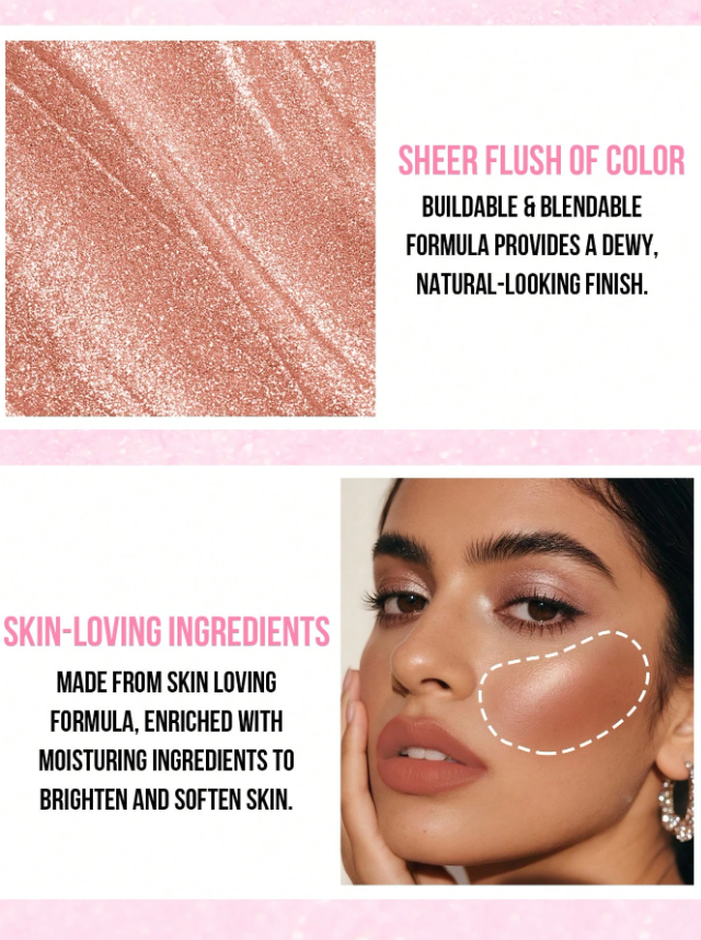 - Versatility:Â The product can be applied to the cheeks and can also be used on the lips. It can also be mixed with foundation for an all-over glow.