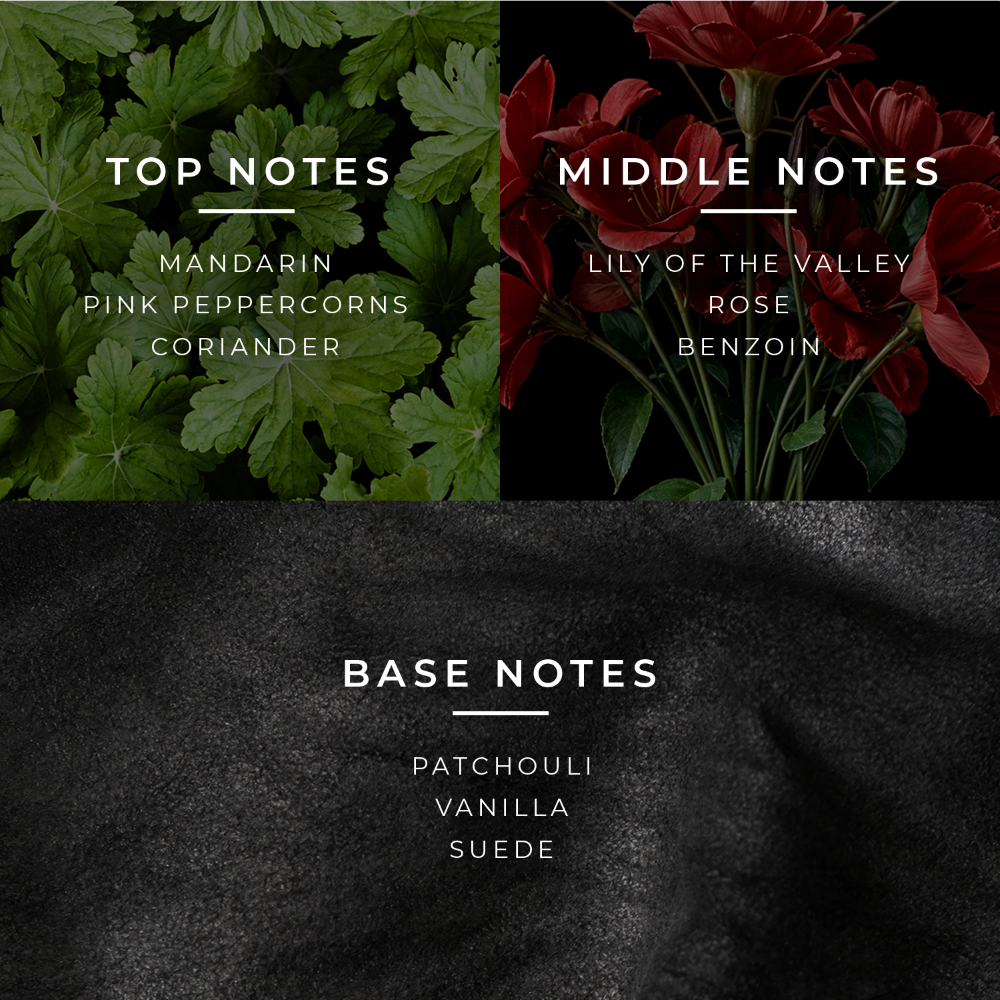 At its heart, the fragrance unfolds with rich floral notes of lily of the valley, rose, and benzoin, adding depth and balance to its composition. The scent finally settles into a warm base of suede, vanilla, and patchouli, leaving behind an irresistible trail that defines strength and charisma.