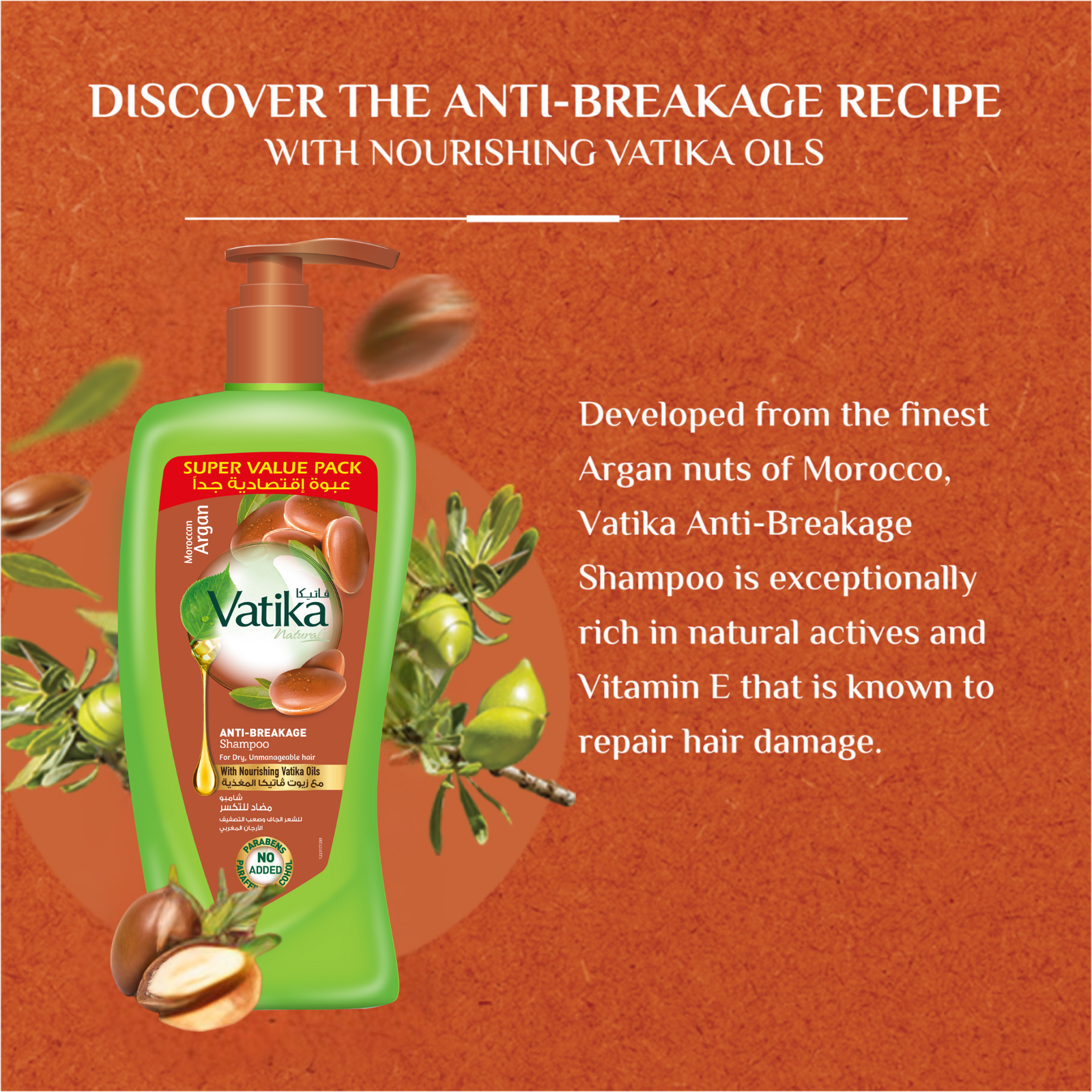 The Vatika Naturals Moroccan Argan Anti Breakage Conditioner is all you need for soft hair with moisture retained. The conditioner works wonders on dry and unmanageable hair with the goodness of Moroccan Argan which helps replenish unmanageable hair, making it soft, silky, and smooth giving you the hair care treatment you require! It’s time to use the scientifically formulated shampoo for strong, resilient and naturally thick hair! For best results, use the conditioner after gently rinsing your hair with the Vatika Naturals Moroccan Argan Anti Breakage shampoo!