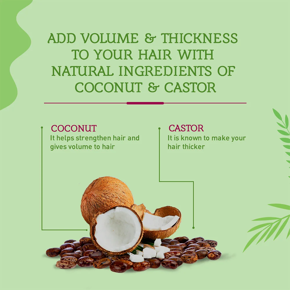 Nourish your precious hair strands simply in 20 minutes with Vatika Naturals Coconut Enriched Hair Oil for Volume and thickness with the goodness of Vitamins A, E, and F. The natural coconut oil for thin hair in men, women, and kids is a blend of various natural herbs which strengthen your hair follicles and also improve luster. The perfect blend of coconut, castor, and henna will help you achieve that bouncy healthy hair with lots of volumes that you have always dreamed of! The 100% Natural formula by Vatika Naturals Coconut Oil is paraben, sulfate, and silicone free. Strengthen your hair from root to tip with Vatika Naturals Enriched Coconut Hair Oil with all the herbal leaves.