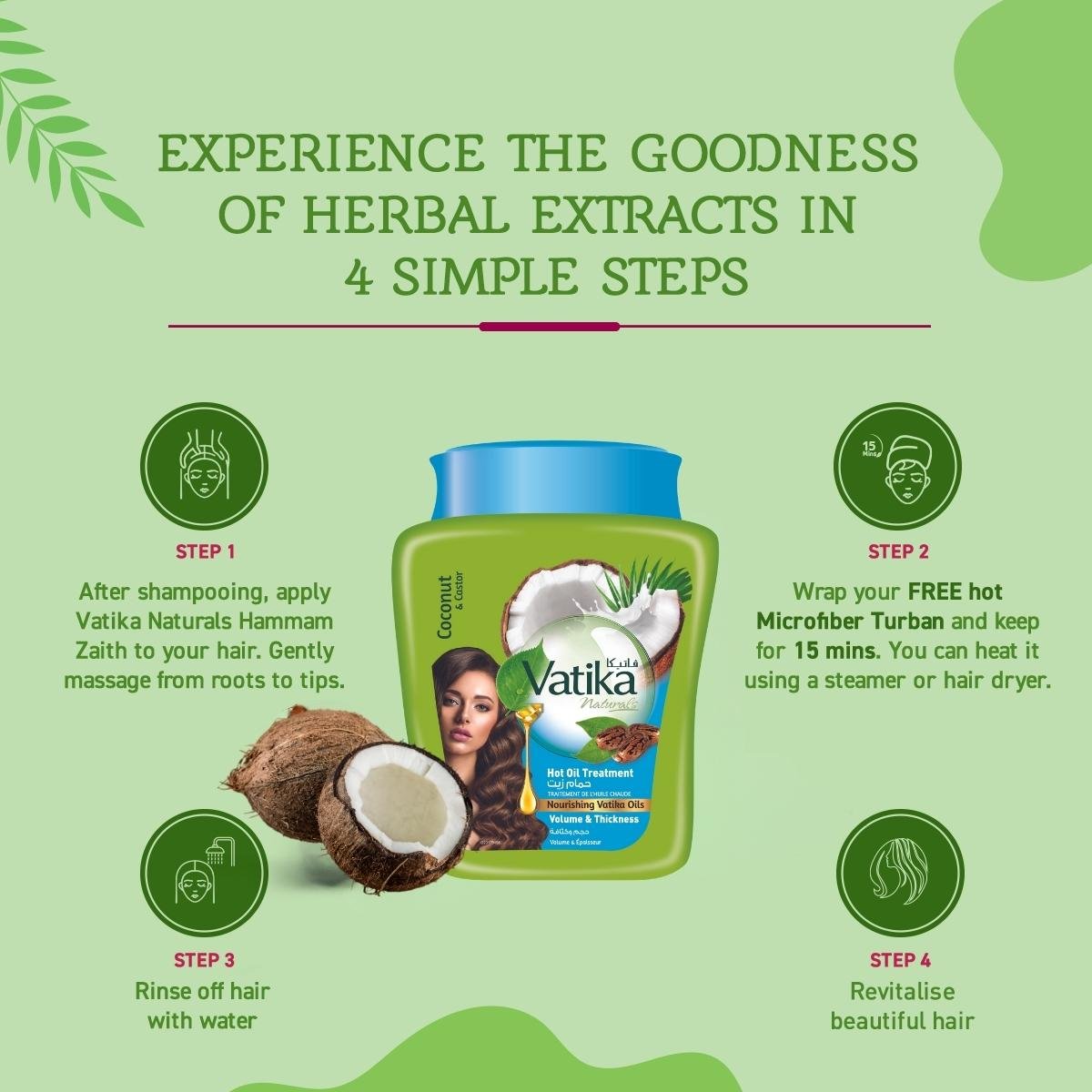 Vatika Naturals Hot Oil Treatment with Coconut and Castor and free microfiber towel, commonly known as the Hammam Zait volumizes and thickens your hair with its richness in vitamin E and antioxidants. It energizes your hair along with the nourishing Vatika Oils which help control hair fall. The natural ingredients like coconut and castor enriched with Vatika oils and its herbal recipe nourish your hair from the root to tip, making it healthy, shiny, and full of volume. The hair mask is specially made for damaged hair, split ends, or Limp hair. It’s time to Bid Goodbye to dry, dull and lifeless hair! Check out our entire range and find the best fit for you.
