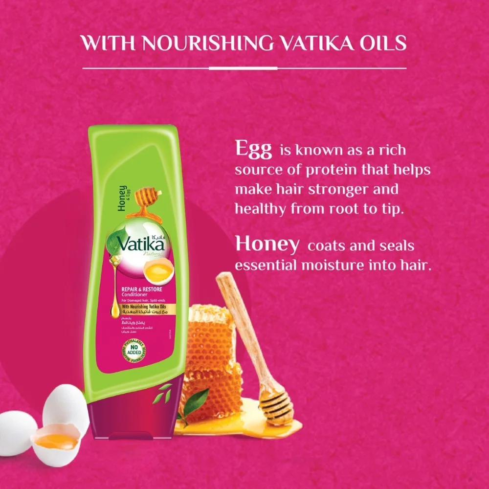 Do Split-ends and Damaged hair bother you? The Vatika Naturals Repair & Restore Conditioner with the goodness of natural ingredients namely Egg and Honey is the perfect solution for Damaged hair. The hair repair conditioner is enriched with Vatika Oils and it’s an herbal recipe, the product intensely nourishes your hair from the root to tip and replenishes moisture. For best results, use the conditioner after gently rinsing your hair with the Vatika Naturals Repair and Restore Shampoo enriched with the goodness of honey and egg!