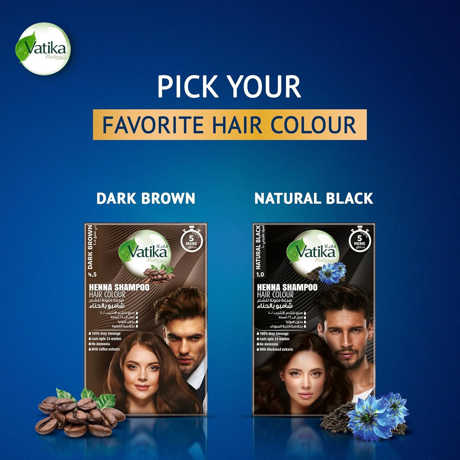Indulge in the luxurious at-home transformation of your hair with Vatika Naturals Henna Shampoo Hair Colour in just 5 minutes! Enriched with invigorating Coffee Extracts, our formula not only delivers a stunning and natural dark brown hue but also provides intensive nourishment, leaving your hair irresistibly soft and manageable. The 100% ammonia-free blend ensures a gentle colouring process that covers 100% of grey and white hair seamlessly, enhancing your hair’s authentic beauty. Revel in the vibrancy that lasts up to 24 washes, as the formula penetrates each strand, creating a long-lasting and captivating dark brown finish. Experience the perfect blend of nature and colour, unveiling healthier, revitalized, and elegantly coloured hair! Discover your perfect instant hair colour match – also available in Natural Black Colour enriched with Blackseed Extracts.
